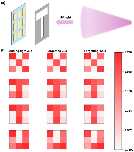 (a) The 3 × 3 flexible optoelectronic synapse array and the patterned mask. The UV light irradiates the mask and then illuminate the unshielded devices in the array. (b) Images of the array after 30 s of UV light illumination, and following 30 s and 120 s of forgetting. (The color intensity reflects the logarithmic change in device current).