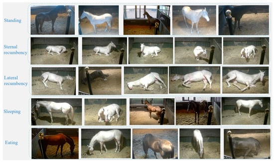 Horses are common domestic animals, often used for sports, companionship, and various work roles [1]. Historically, horses were considered crucial partners in agriculture and warfare, especially in transportation. Today, they play prominent roles in sports, leisure, and tourism [2]. In the equine industry, particularly for sport horses, continuous individual stall housing is prevalent. However, increasing scientific evidence suggests that such stall conditions may have negative effects on the health of horses [3]. The behaviors of a horse are key indicators of their health status, as changes in behaviors can signal underlying health issues. Therefore, monitoring horse behaviors in stalls to assess their health status is important in modern equine management. However, there are various problems such as high cost, focus, and easy fatigue in monitoring multiple horses manually. Therefore, it is necessary to use advanced equipment and technical means to identify horse behaviors.