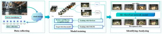 The overall technical route used in this study is illustrated in Figure 4, which is divided into three stages: data collection, model training, and identifying-analyzing. In the data collection stage, high-definition cameras were deployed on the beams of the stall to collect video data of the horses. The collected video data were stored on a cloud server. In the model training stage, we constructed two datasets using a set of identical frame images: a COCO (Common Objects in Context)-format dataset for YOLOX target detection, named ODHS (Object Detection Dataset of Horses in Stall), and a spatio-temporal dataset in AVA format for SE-SlowFast behavior recognition, referred to as STHPB (Spatio-Temporal Dataset of Horse Postures and Behaviors). The SE-SlowFast model was trained on the STHPB dataset to obtain a pre-trained model for horse behavior recognition, which can be used to identify horse behaviors in video frame sequences. Additionally, YOLOX was used to replace the original object detector, FastRCNN, in the SlowFast algorithm. This replacement improves both the speed and accuracy of detecting horse targets in videos. In the final stage, we performed behavior recognition on the horse video data, comprehensively recording and analyzing the recognition results.