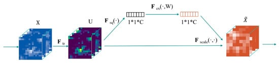 The basic structure of the SE Module is shown in Figure 6. For any given transform F t r : X → U, X ∈ RW′×H′×C′, U ∈ RW×H×C. F t r is a standard convolutional operator process. The symbol * represents the multiplication operation, used to describe the spatial dimensions. As shown in Formula (3), X represents the input feature map and V c , c is the convolution kernel. The symbol denotes the convolution operation. Through this convolution operation, each layer of the input feature map X undergoes a convolution operation with a 2D convolution kernel, ultimately producing C output feature maps, which form the feature map U.