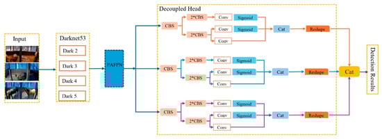 To better recognize equine targets in key frames of the video, we utilized YOLOX as the object detection algorithm, as illustrated in Figure 7. YOLOX is based on YOLOV3 and Darknet 53, employing the structure of the Darknet 53 backbone network and SPP layer. A key feature of YOLOX is the use of a Decoupled Head, which enhances the convergence speed of the model and achieves end-to-end performance.