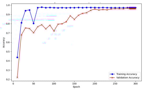 To ensure that the SE-SlowFast algorithm can efficiently recognize horse behaviors in video data, we labeled the extracted frame images to create a target detection dataset, ODHS (Object Detection Dataset of Horse in Stall), with a total of 1920 labeled images. The category label is “Horse”, and the dataset is divided into training and test sets in a ratio of 8:2. YOLOX was utilized for object detection training, and, as shown in Figure 8, The blue curve represents the accuracy of the training set, while the red curve represents the accuracy of the validation set. When Epoch = 60, the accuracy of the training set begins to stabilize, with the optimal accuracy reaching 97.2%. In comparison, as the number of training epochs increases, the accuracy of the validation set stabilizes at Epoch = 200, with the optimal accuracy reaching 96.4%. This accuracy ensures that YOLOX, integrated with the SE-SlowFast network, can effectively detect the horse targets during the video data recognition phase.