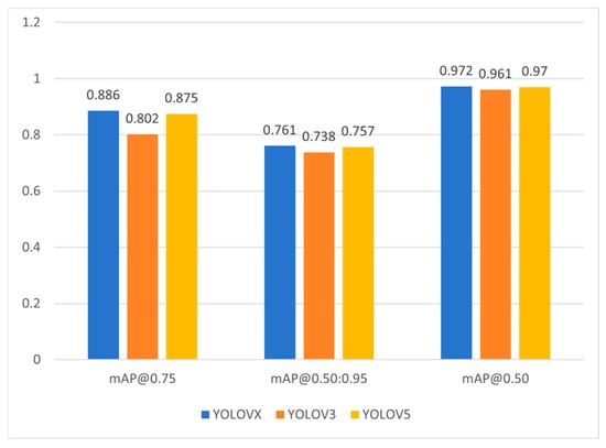 This study compares the performance of YOLOX with other versions of the YOLO algorithm on the ODHS, such as YOLOV3 and YOLOV5. During the training process, the network structures of the three models were kept unchanged, and the training parameters were ensured to be consistent. The final training results are shown in Figure 9. The results indicate that, although YOLOV3 and YOLOV5 have unique network structures, their performance on this dataset was not satisfactory. Therefore, we ultimately selected YOLOX.