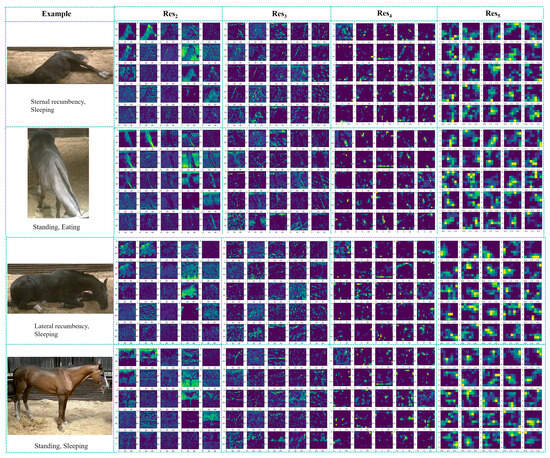 In the SlowFast algorithm, the Slow pathway primarily handles behavioral feature extraction, while the Fast pathway focuses on capturing dynamic information to compensate for the Slow pathway’s limitations in this area. By integrating the Slow and Fast pathways in a coordinated manner, the SlowFast network can simultaneously capture both slow and fast dynamic information in videos, enhancing its ability to recognize actions effectively. In the experiment, we visualized the output features of the Slow pathway. As shown in Figure 10, the visualizations of feature extraction were performed before each of the later connections, resulting in a total of four extractions. It can be observed that, before the first later connection, the Slow pathway had already learned behavioral features from the input image. For instance, in the ‘Standing, eating’ image, due to the horse’s uniquely long neck, we can clearly observe that the Slow pathway has effectively learned the main features of the image during the initial feature extraction. Similarly, after the first feature extraction, it is evident that the main features of the other three images have also been learned by the Slow pathway. As the network deepens, feature learning becomes more sophisticated; by the third and fourth rounds of feature extraction, it becomes challenging for human observers to interpret these deeper features accurately. However, with close observation, the Slow pathway appears to have learned the features of the ‘Standing, Sleeping’ image even in the second feature extraction. Through these feature maps, it is evident that the SlowFast network has successfully learned key behavioral features of the horse.