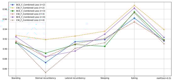 This study compares the training performance of BCE_F_Combined Loss (Binary CrossEntropy Loss combined with Focal Loss) and CW_F_Combined Loss (Class Weighted Loss combined with Focal Loss). In the experiments, we found that when r < 2 or r > 4, the accuracy significantly decreased. Therefore, a total of six experimental rounds were conducted, each assigning a different value of r to Focal Loss. As shown in Figure 11, the model’s prediction accuracy varied with different r values. When r = 2, training with CW_F_Combined Loss improved the accuracy across all categories, with a particularly notable increase in the accuracy for ‘Sternal recumbency’, resulting in the highest overall accuracy.