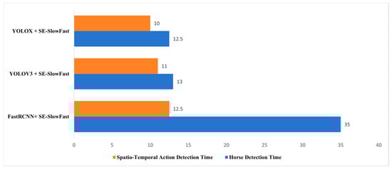 The SlowFast network relies on a target detection algorithm for behavior recognition, and this study uses YOLOX as the detector. To further evaluate the video recognition efficiency of YOLOX + SE-SlowFast, ten 60 s videos were used in the experiment, with detection time measured in seconds. The horses in the videos were identified first, followed by an analysis of their spatiotemporal behavior. As shown in Figure 12, when comparing the horse detection time and spatiotemporal movement detection time, both YOLOV3 + SE-SlowFast and YOLOX + SE-SlowFast significantly improved video recognition processing times compared to FastCNN + SE-SlowFast. YOLOX + SE-SlowFast demonstrated the best processing speed and faster overall performance. Therefore, YOLOX can serve as an effective target detection algorithm for horses, combined with the SE-SlowFast algorithm to achieve rapid recognition of horse behaviors.