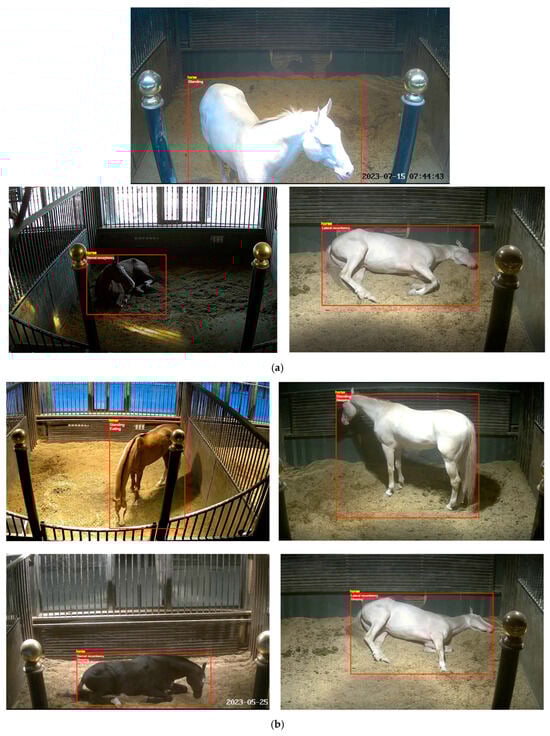 Figure 13. Examples of predicting horse postures and behaviors. (a) Predictions of horse postures. (b) Predictions of horse behaviors.