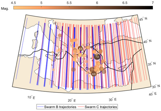 The satellite tracks are grouped into four quarters of the year (2020 and 2021). Firstly, a reference track is selected close to the center of the region. Typically, this Swarm pass takes place in the middle of the quarter (day 45 or 46), but there are some exceptions, and occasionally the reference track is selected on a day distant from the middle of the selected time period (e.g., 65th). This is necessary in order to find a Swarm pass possibly close to the center of the region and in the nighttime. Once such reference track is selected, then around 90 tracks (one pass daily) are adjoined, with a longitudinal separation from the reference track smaller than 20° and a temporal separation in UTC time smaller than 4.6 h. These apparently large thresholds are required to ensure that observations over the region correspond to approximately the same time and location and also to ensure tracks are considered almost daily, having only minor single-day gaps. Summarizing, two years of Swarm passes over the boundary between the African and Eurasian tectonic plates (in the close vicinity of the Hellenic Plate) have been selected—one track daily during the nighttime. The selection has minor gaps due to variable longitudes of Swarm orbit footprint, but these gaps do not affect overall findings. The example selection of Swarm B/C trajectories in the last quarter of 2020 is shown in Figure 1, together with selected earthquakes at that time. The selections in the other quarters of 2020 and 2021 follow the same rules, and respective locations of the tracks depend only on the current Swarm constellation geometry. The longitudinal location of the tracks can differ by 40°, but all the passes cross the tectonic plate connection orthogonally, which is an important assumption in this study.