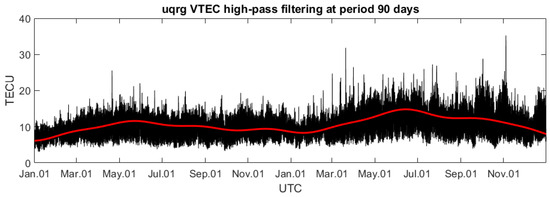 The ground-based VTEC is integrated over the spatial baseline including Swarm and Digisonde areas of detection and reaches even further to 20,000 km. This supplies more signal components, and therefore the VTEC signal is the most complex one out of the selected three. This complexity makes the spectral analysis of such signal more challenging, and it requires many iterations and processing with modified parameters. Therefore, at this experimental stage, we can determine the most obstructing signals, and at the same time, the most unwanted wave periods in the detection of co-seismic disturbances in the ionosphere. Similarly to Digisonde data, the same lower bound of the high-pass filter of 90 days is applied to VTEC data (Figure 4). This long-wavelength trend removal facilitates the analysis of shorter wavelengths. Two years of observations provide a good sample for the analysis of periodic signals within the range of 1–90 days. However, the determination of VTEC between the receiver and single GNSS satellite is possible only over several hours. Therefore, the generation of two-year data series from, e.g., the NOA1 GNSS receiver, would require averaging of VTEC observations to several satellites at different elevations or even need inclusion of more stations for VTEC calculation and averaging of VTEC over some area surrounding Athens. This would be an interpolation, being more simplified than stochastic (kriging) modeling, applied in the creation of UQRG GIM. Moreover, the shortest analyzed wave period here is the diurnal one, which does need high temporal resolution of GNSS data series. Therefore, it is decided to use VTEC interpolated from GIM at this stage of the research. The UQRG provides a model computed by tomography and kriging modeling [63,64]. Presently, UQRG is the most or one of the most accurate GIMs [65,66,67]. These global VTEC maps give a unique view of the dynamics of the electron content at a global scale, with VTEC maps provided every 15 min, with a latency of 1 day. The horizontal grid resolution is 2.5° N-S and 5° E-W, which is the standard established for GIMs.