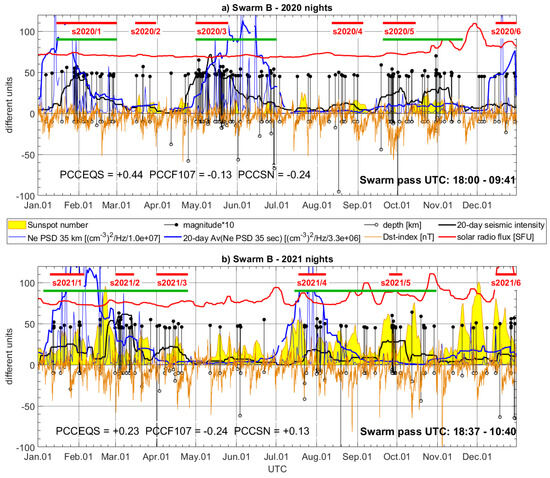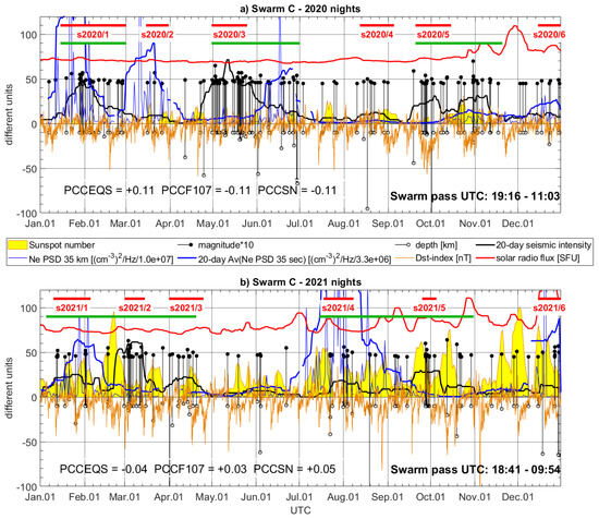 A notable visual correlation of Swarm Ne disturbances with seismic activity also encouraged supplementary calculation of Pearson correlation coefficients (PCCs) between averaged Swarm and seismicity denoted in Figure 5, Figure 6, Figure 7, Figure 8, Figure 9, Figure 10, Figure 11 and Figure 12 as PCCEQS, Swarm, and sunspot number denoted as PCCSN and Swarm, with solar radio flux denoted as PCCF107. The averaged Swarm Ne PSD, as well as 20-day cumulative seismic intensity, is applied for PCC calculation. The F10.7 parameter does not include significant variations at frequencies shorter than tens of days, which makes it directly more comparable with several-day LAIC processes and several-day changes in ionospheric signals. The sunspot numbers also exhibit unbroken increases within around 20-day windows, and therefore, both solar parameters are applied without averaging. The PCC of Swarm B in Figure 5a informs us about a notable correlation between Swarm signal and seismicity (PCCEQS = +0.44) and no positive correlation between Swarm and solar parameters (PCCF107 = −0.13, PCCSN = −0.24). In Figure 5b, respective correlations of Swarm are also slightly higher with seismic intensity (PCCEQS = +0.23, PCCF107 = −0.24, PCCSN = +0.13). In Figure 6a, representing Swarm C, the correlation with seismicity is also noticeable in PCCEQS = +0.11, but again negative in PCCF107 = PCCSN = −0.11. The year 2021 (Figure 6b) of higher solar activity reveals all Swarm C correlations at almost zero level (PCCEQS = −0.03, PCCF107 = +0.04, PCCSN = +0.05). A noticeable positive correlation of Swarm Ne increase with SN (Figure 5b) or comparable correlations of Swarm with seismicity and solar parameters (Figure 6b) can be also explainable, as several recent studies report on suspected relations between solar radiation and earthquakes [68,69]. The aim of this study is to initialize extraction of the frequencies, which are more sensitive to closer-distance processes acting from below than to more distant solar sources. Future spectral analyses in narrow spectral bands and with higher time–frequency resolution can help in more precise separation of the frequencies and identification of the signal sources. We believe that the presented spectrograms can be a starting point and helpful in the further planning of the next studies and data selection.