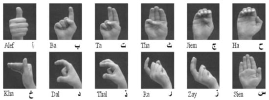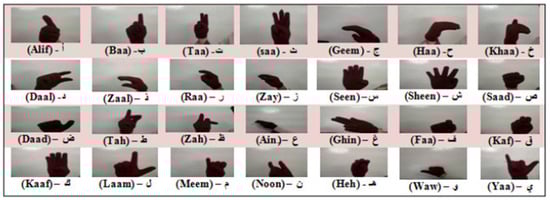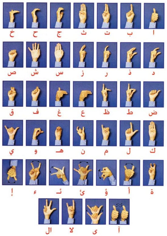 The language that is spoken throughout the Middle East and North Africa is unified ArSL [2]. Although there are 28 letters in the Arabic alphabet, Arabic sign language uses 39 signs [14,15], as depicted in Figure 2. The eleven extra signs are fundamental signs made up of two letters combined. For example, in Arabic, the two letters “ال” are frequently used, much like “the” in English. Thus, the 39 signs for the Arabic alphabet are used in the majority of reviewed works on Arabic sign language recognition (ArSLR) [9,15].