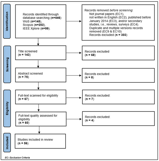 Of the 446 papers in the initial search, the exclusion criteria were applied automatically to select eligible papers as follows: 303 papers were discarded because they were conference proceedings, data papers, books, notes, theses, letters, or patents (EC1), not written in English (EC2), published before January 2014 (EC3), and/or secondary studies, i.e., reviews, surveys (EC4). At this stage, the number of remaining papers was 62, 74, and 7 in Web of Science, Scopus, and IEEE Xplore, respectively.