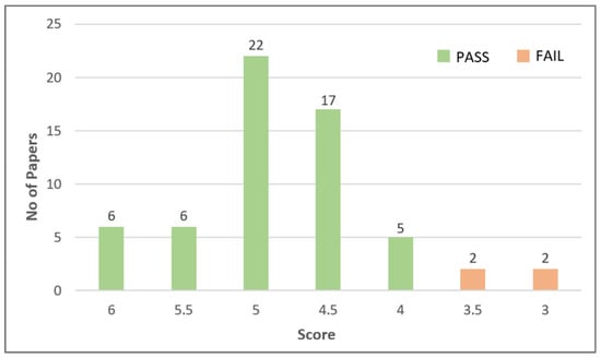 It is deemed essential to assess the quality of the primary studies in addition to inclusion/exclusion criteria to offer more thorough criteria for inclusion and exclusion, to direct the interpretation of results, and to direct suggestions for further research [16]. In-depth assessments of quality are typically conducted using quality instruments, which are checklists of variables that must be considered for each primary study. Numerical evaluations of quality can be achieved if a checklist’s quality items are represented by numerical scales. Typically, checklists are created by considering variables that might affect study findings. A quality checklist aims to contribute to the selection of studies through a set of questions that must be answered to guide the research. In the current study, a scoring system based on the answers to six questions was applied to each study. These questions are: