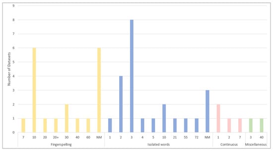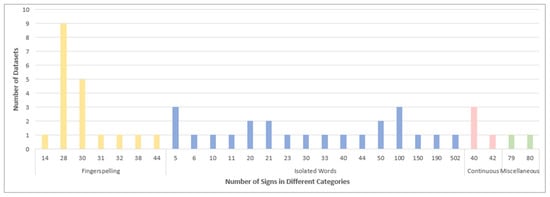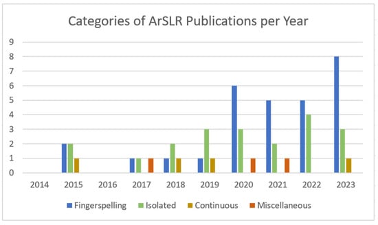 A review of the ArSLR background, architecture, approaches, methods, and techniques in the literature published between 2001 and 2017 was conducted by Al-Shamayleh et al. [9]. Vision-based (image-based) and sensor-based approaches were covered. The three levels of ArSLR for both approaches, including alphabet recognition, isolated word recognition, and continuous sign language recognition, were examined with their corresponding recognition rates. The study also identified future research gaps and provided a road map for research in this field. Limited details of the utilized datasets in the reviewed papers were mentioned, such as training and testing data sizes.