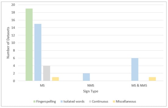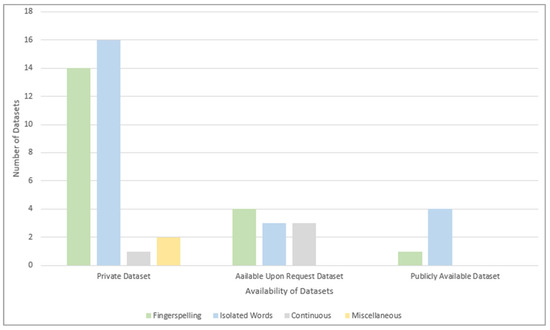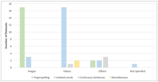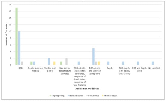In 2014, Mohandes et al. [17] presented an overview of image-based ArSLR studies. Systems and models in the three levels of image-based ArSLR, including alphabet recognition, isolated word recognition, and continuous sign language recognition, are reviewed along with their recognition rate. Mohandes et al. have extended their survey [17] to include not only systems and methods for image-based ArSLR but also sensor-based approaches [15]. This survey also shed light on the main challenges in the field and potential research directions. The datasets used in some of the reviewed papers are briefly discussed [15,17].