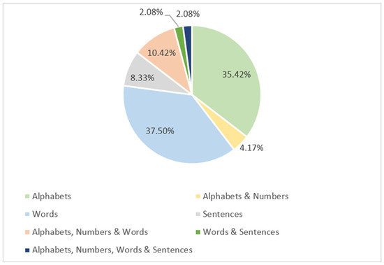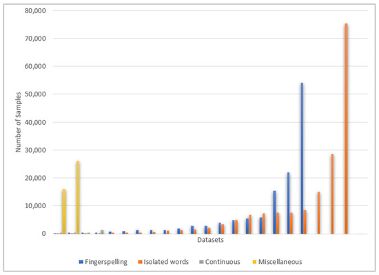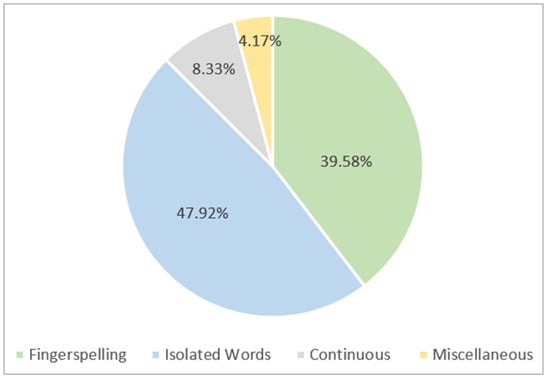 SLR research efforts are categorized according to a taxonomy that starts with creating systems that can recognize small forms and segments, like alphabets, and progresses to larger but still small forms, like isolated words, and ultimately to the largest and most challenging forms, like complete sentences [4,9,15]. As the unit size to be recognized increases, the ArSLR job becomes harder. Three main categories—fingerspelling (alphabet) sign language recognition, isolated word sign language recognition, and continuous sentences sign language recognition—can be used to classify ArSLR research [9,15].
