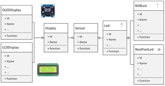Inheritance is the process by which objects of one class acquire the properties of objects of another class. It supports the concept of hierarchical classification. Let us have a general sensor class that describes the given sensor using its name and unique identification (e.g., sensor serial number). Then, the “RGBLed” class is part of the “Led” class, which is derived from the “Sensor” class (see Figure 3). The principle of this kind of division is that each derived class shares common properties with the class from which it is inherited. In the object-oriented approach, the concept of inheritance provides the idea of reusability. That is, we can add additional properties to an existing class without having to modify it. This is possible by deriving a new class from an existing class.