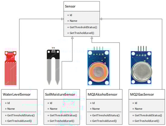 Another important concept of the object-oriented approach is polymorphism. Polymorphism is a Greek term meaning the ability to take on more than one form. A function can exhibit different behavior in different instances. The behavior of a function depends on the type of data used in the function. Polymorphic behavior is implemented in different programming languages at a different level of abstraction, fulfilling the basic idea of overriding a function in a child derived from a base class [3]. The process by which a function exhibits different behaviors in different cases is known as function override. Thus, in the context of C/C++, overriding is a technique that enables polymorphism, and polymorphism is a concept that uses overriding to achieve flexible and extensible code. For example, consider the “GetTresholdStatus()” function, which displays a sensor’s status after it has exceeded a certain level related to a specific physical quantity. Figure 4 illustrates that one function name can be used to operate different types of sensors.