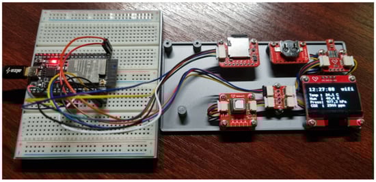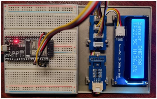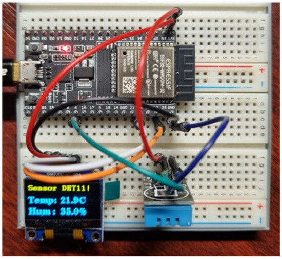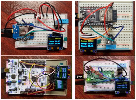 The setup() method initializes the serial link communication and the I2C protocol. The loop() method is repeated every 1 s, corresponding to the measurement period. We subsequently deployed the same project on the following microcontrollers shown in Figure 15. Since we are using different microcontrollers, each circuit is slightly different. Mainly, it is the connection of the DHT11 sensor data pin.