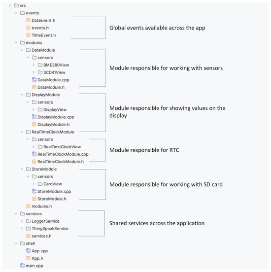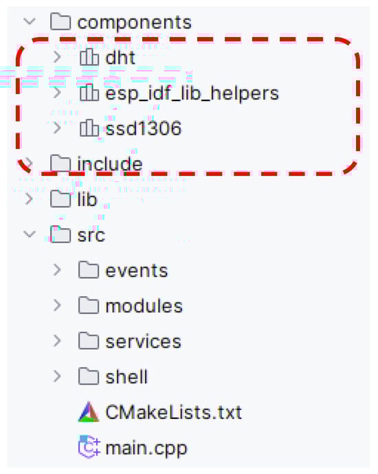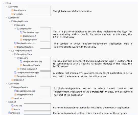 The main goal is to create an application that efficiently reads data from the DHT11 sensor and then visualizes these data on a connected display, allowing users to view current environmental conditions easily. To achieve this goal, we follow a recommended application structure that is designed to make the most of the principles of modularity and code clarity. The structure of the project, illustrating the layout of the single-individual modules, is shown in Figure 8.