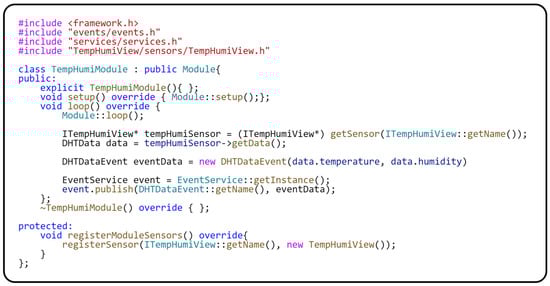 Looking at the attached code in Figure 9, there is no direct interaction with the platform-dependent sensor within the implemented module. The class for communicating with the sensor is registered in the registerModuleSensors() method. This method of integration demonstrates critical aspects of modular architecture, such as dependency separation and a high degree of context separation. An important role within the module is played by the loop() method, which represents the central execution loop. During this loop, an abstraction is used to get data from the sensor, specifically through the getSensor(…) method. This method ensures obtaining an instance of the abstract interface of the sensor, which allows the separation of the application logic from the specifics of the given hardware.