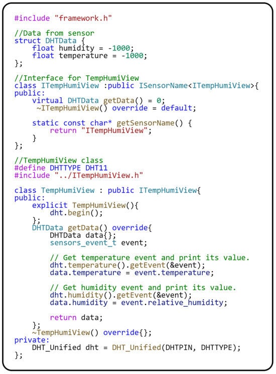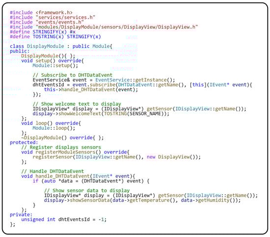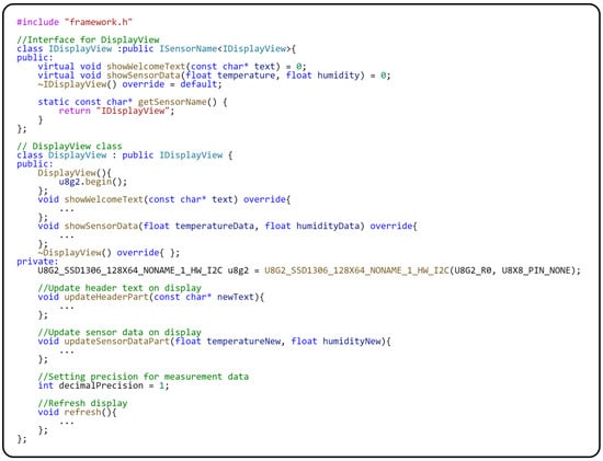 The Sensor–View design pattern [9] is used for communication with the sensor to implement the independence of the application logic stored in the module. The primary role in implementing the Sensor–View design pattern is represented by the ITempHumiView interface, which contains the getData() method for obtaining data from the sensor. Specifically, the getData() method of the TempHumiView class interacts directly with the DHT11 sensor. This interaction is implemented through the standard sensor driver so that the getData() method gets the current temperature and humidity data directly from the sensor. It is important to note that the initialization of the DHT11 sensor is performed in the constructor of the TempHumiView class using the dht.begin() statement. For the correct operation of the driver, it is necessary to define which GPIO pin the sensor is connected to, which is performed through the DHTPIN macro. This greatly improves clarity and makes the code easier to maintain since the physical sensor connection is defined centrally and, thus, not spread throughout the program. Now that we have described the module responsible for data acquisition, let us focus on the DisplayModule, responsible for displaying data on the screen. The implementation of this module in the source code is provided in Figure 11.