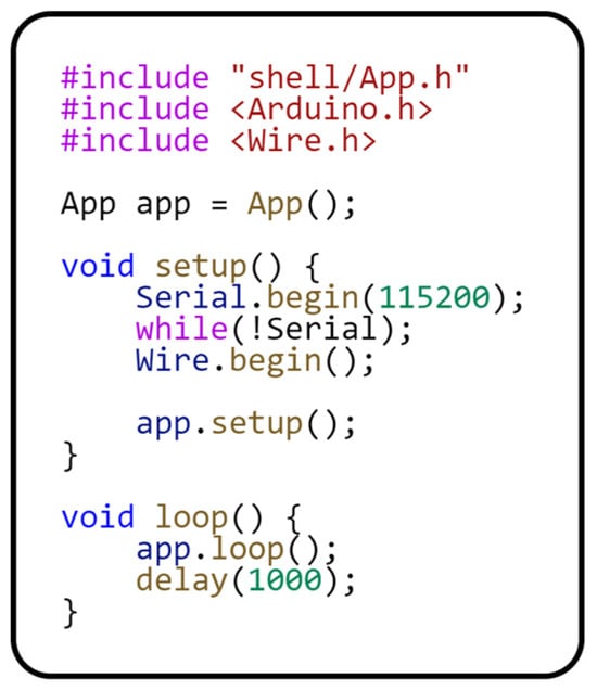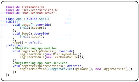 Now that we have described the behavior of the modules and their hardware dependencies, we can move on to the description of the App class. This class is inherited from the Shell class and implemented within the Modular framework. The Shell class implements general module handling. The App class implementation is platform-independent and fully shielded from any hardware dependencies. The following code in Figure 13 shows the implementation of the App class.