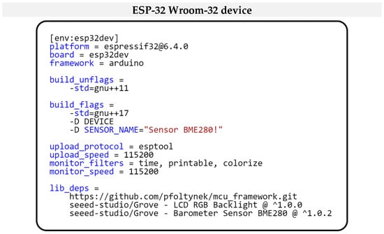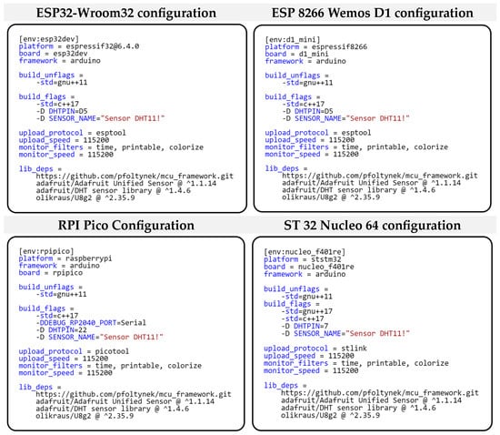 We solved this variable setting through the preprocessor directive switch “-D,” which is used when compiling the program. Thus, the main change in deploying our framework on different microcontrollers is only in the configuration of the given project. Figure 16 shows the project configurations for each microcontroller. As you can see from the individual configurations, the configurations differ only in the DHTPIN switch. We can also notice that all projects are set to support C++ 17. This setting is required by our modular framework, which is built on modern features and paradigms of this standard, such as advanced template functions, lambda-da expressions, and strong-type safety. These allow for the creation of a more efficient and readable code. In the project configuration, we further define dependent libraries that provide not only drivers for hardware peripherals, but also the framework we developed. We currently provide the library for the framework developed by us using a link to the GitHub project [15]. We then use a standard public repository to obtain the remaining libraries. We use the “U8g2” library to communicate with the OLED display. For communication with the DHT11 sensor, we use the “DHT sensor library,” which requires the “Adafruit Unified Sensor” library for its correct functionality. This library provides a unified interface for working with different types of sensors.