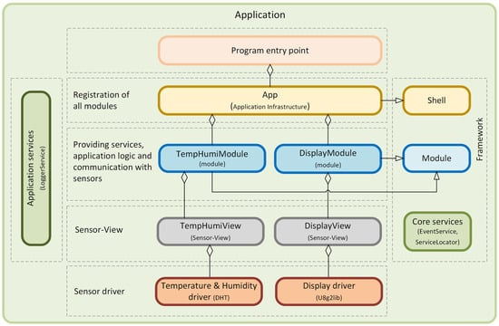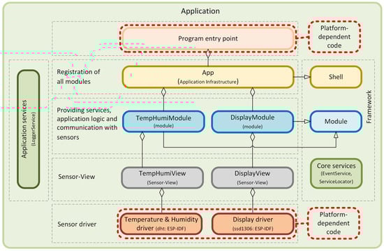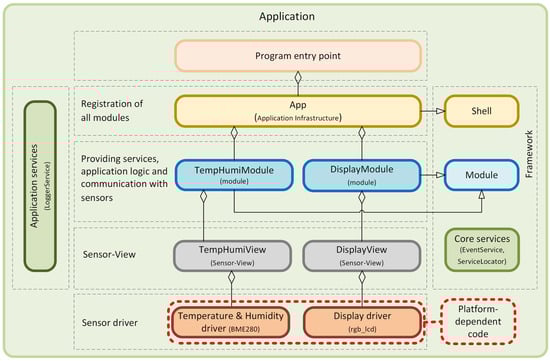 This test case was specifically designed to showcase the adaptability of our framework to various microcontrollers. Figure 17 visually represents the described example. It shows the dependencies of the individual components in the program that were used in the source code for this example. The different layers of responsibility of the application are also clearly visible. The results unequivocally demonstrate that our framework can be seamlessly deployed on different platforms, providing us with a wide range of options. Whether it is replacing one microcontroller with another or transitioning from one generation of devices to another, this adaptability is a cornerstone of our long-term sustainable projects. It empowers us to swiftly respond to evolving requirements and technological advancements, making it an indispensable feature for efficient and sustainable application development in the dynamic IoT environment. The complete source code for this example is available on the GitHub portal [16].