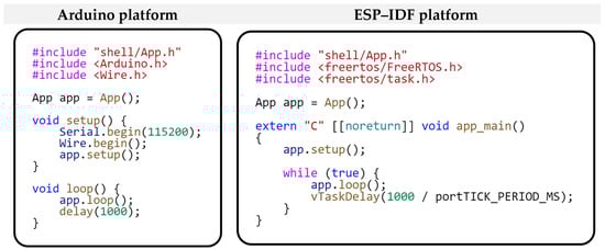 Our focus in this comparison will be on the platform-dependent part. This is because the application logic implemented within the modules remains unchanged from the previous example, allowing us to focus directly on the differences arising from these development platforms’ specific characteristics. We will start comparing individual platforms from the application’s entry point. Figure 18 shows how application entry points differ for different development platforms. We already described the entry point for the Arduino platform in the previous example. The application entry point for the ESP–IDF framework uses a more standard programming approach. At the beginning of the app_main method, the setup() method of the App class is called, where the whole modular framework is initialized. This is followed by creating an infinite loop using while(true), in which the loop() method of the App class is called periodically. The last statement within this loop is a call to the vTaskDelay(…) function, which will pause the loop for a certain amount of time. In our case, this is to pause the program for one second. The vTaskDelay(…) function corresponds to the delay() function from the Arduino platform. As you can see, even though the entry points of the applications differ in their notation, their meaning and functionality are the same. The application entry point is defined as platform-dependent within the project structure. However, this platform dependency does not affect the application logic that is implemented within the modules.