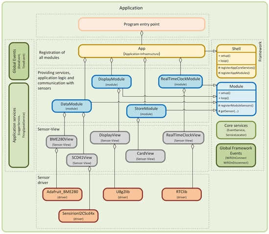 Now that we have discussed the DataModule and RealTimeClockModule, which provide data at specific time intervals, we will move on to a description of the DisplayModule, which displays this data on the screen. Again, we will first describe this module’s setup() method. At the beginning of the setup() method, the hardware display module is first registered in the registerModuleSensors() method. This behavior is provided because the DisplayModule inherits from the Model class, which is implemented in the framework. This dependency can be seen in Figure 27. In the next part of the setup() method, individual global events are gradually subscribed through the EventService class. The first global registered event is TimeEvent, provided by the RealTimeClockModule. The processing of this subscribed event is performed using the handle_TimeEvent(…) method, and the complete code of this module is in [15]. In this method, the hardware display module, implemented using the Sensor–View design pattern, is accessed, and a method is called to provide a redraw of the time displayed on the display. Another subscribed global event is the DataEvent, which the DataModule provides. This module provides us with the measured values from the BME280 and SCD41 sensors. This event is processed within the handle_DataEvent(…) method [15]. Subsequently, a method used on this hardware module that displays the measured values on the display. Other global events for which we register subscriptions are WifiOnConnect and WifiOnDisconnect. These events are part of our modular framework and provide information about the connection or disconnection of a given microcontroller from the Wi-Fi network. To handle these global events, the methods (handle_WifiOnConnect(…), handle_WifiOnDisconnect(…) [16]) are called to react to changes in the connection status of the microcontrollers to a given wireless network. Within these methods, the hardware display module is accessed by default to display the status of the connection to the Wi-Fi network. Another method implemented in the DisplayModule is the loop() method, which does not implement any application logic. DisplayModule responds to global events provided by other modules, and therefore, no regular activity is required within this method.
