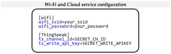 Figure 28 shows the format of the ini configuration file stored on the SD card. As we can see, the ini configuration file has two sections. The first section is Wi-Fi, which contains the settings for connecting to the Wi-Fi network. The second section is ThingSpeak, where the settings for connecting to the ThingSpeak cloud service are stored. This configuration format allows users to customize the application’s network settings according to their specific needs and requirements.