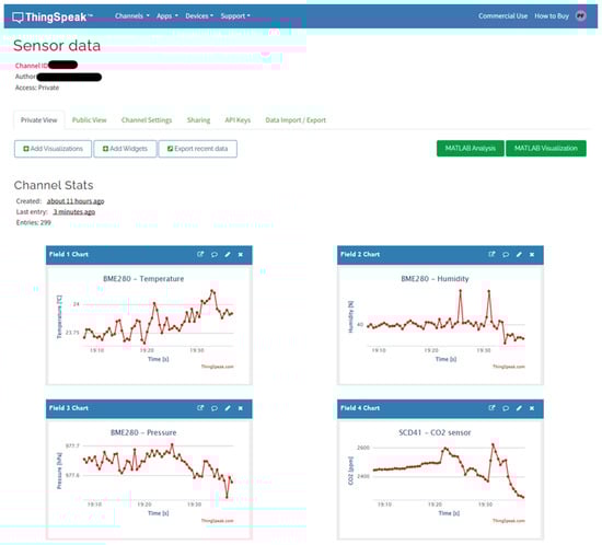 The initialization of the shared ThingSpeakService is provided in the setup() method of the StoreModule. This service is registered as a global application service via the ServiceLocator class, which is part of our framework and offers the init(…) method for its initialization. In its constructor, the ThingSpeakService subscribes to the global DataEvent provided by the DataModule. The EventService class is used to subscribe to the given event. The constructor is followed by the implementation of the init(…) method, where the input arguments correspond to the configuration for the Wi-Fi network and the connection to the ThingSpeak cloud platform. Within the init(…) method, the private wifiConnectStatus() method is then called, which contains the algorithm responsible for connecting to the Wi-Fi network. Figure 29 shows the ThingSpeak cloud service portal where the data from our example are visualized.