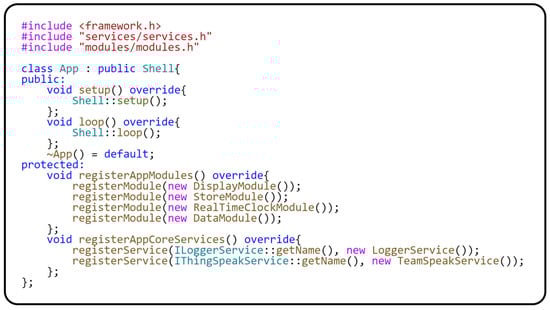 We now describe the implementation of the App class, which is responsible for general module management. This functionality is provided by the fact that the App class inherits from the Shell class, which is part of our modular framework. Furthermore, the App class is fully shielded from any hardware dependencies, making it platform-independent. The following code in Figure 30 shows us the implementation of the App class. The structure of the App class is designed to manage a modular application clearly and efficiently. The main parts of the App class are divided into the registerAppCoreServices() method, which registers the core services used across the application. In our case, two services are registered here, LoggerService and ThingSpeakService. The LoggerService is responsible for a centralized logging mechanism that systematically monitors and logs significant events in the application. This service is essential for efficient debugging and monitoring of application behavior.