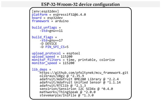 We will now look into the configuration of the project in more detail. Figure 31 shows the configuration for this project. The configuration indicates that the drivers specified in the lib_deps section are used to communicate with the hardware modules. In addition to the drivers for the hardware modules, there is also a library for the communication interface to the ThingSpeak cloud service, explicitly represented by the mathworks/ThingSpeak library. Furthermore, the stevemarple/IniFile library, which is responsible for processing ini files, is listed here. The library that implements our modular framework is represented in the project via a link to GitHub, where its complete implementation is located.