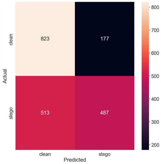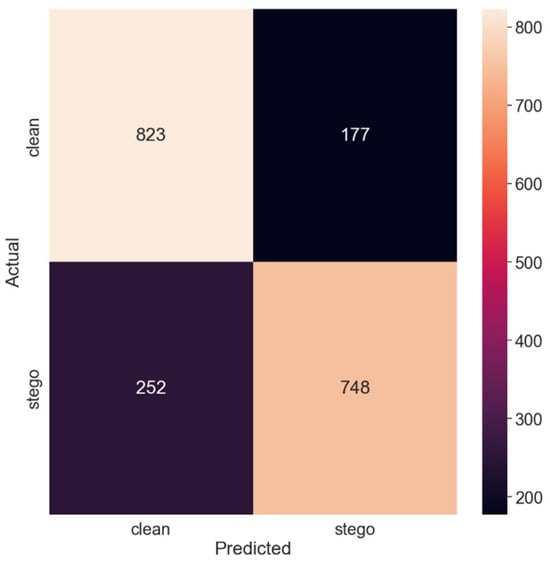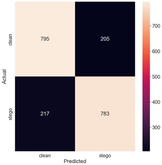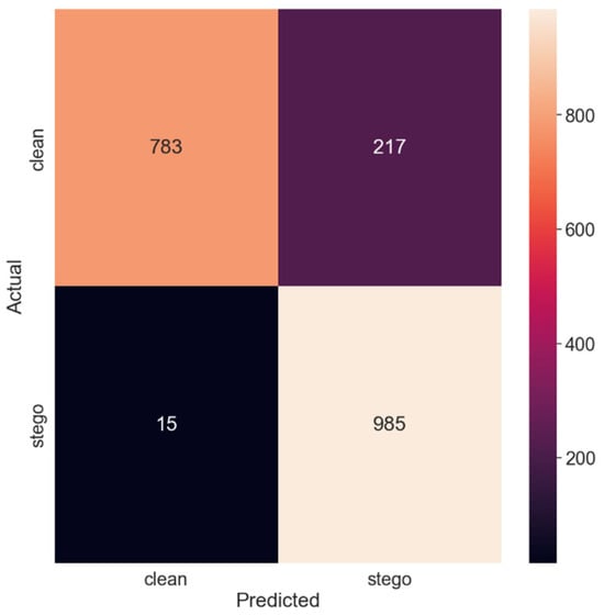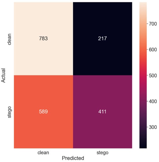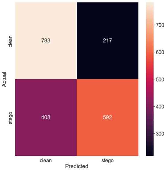 The confusion matrix for the S-UNIWARD method, presented in Figure 7, offers additional clarity on the model’s performance, demonstrating the model’s effectiveness in identifying stego images and its errors in misclassification.