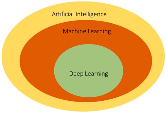 Artificial Intelligence (AI) first began in the 1950s for solving complex mathematical problems and developed significantly in the early 2000s. Machine Learning (ML), a subfield of AI, has played a vital role in the process of collecting and analysing a great quantity of data when engineers and researchers monitor structural health. ML extracts the features and patterns of the images or videos and then enters them into Artificial Neural Network (ANN) algorithms to classify these features. However, ML and ANN algorithms often require experts to monitor and extract the features manually, which can be a limitation for engineers when dealing with huge data loads and complicated features [15,16]. Thus, deep learning (DL) was developed to solve this problem. In contrast to basic ML techniques, DL has multiple hidden layers and can extract numerous complex patterns from data automatically. Accordingly, the accuracy of DL is always higher than ML when dealing with complex and substantial amounts of data [6,17]. Figure 1 shows the subfields of Artificial Intelligence.