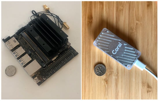 Two popular embedded devices, including Nvidia Jetson Nano (left) and Google Coral USB accelerator (right), with Edge AI capacity [23,24].