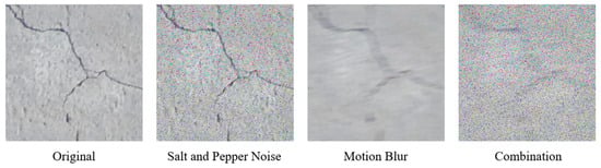 For this research, public datasets have been utilised for concrete crack detection [34]. The datasets contain four subsets, including Original (Orig), Salt and Pepper (SP), Motion Blur (MB) and Combination (Comb). In a realistic scenario, capturing images often encounters difficulties such as an out-of-focus condition or a dirty lens which can negatively affect the quality of image. To simulate these various aberrations, the original image dataset was augmented with three noise patterns: SP, MB and a combination of SP and MB. SP noise introduces random pixel disturbances, simulating scenarios where images might be affected by sensor noise, an incorrect digital ISO setting or transmission errors. On the other hand, MB noise mimics conditions where the camera or object is in motion during image capture, reflecting challenges in real-time inspection.