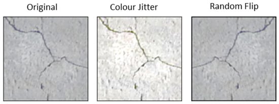 Before the training process, each dataset was augmented with transformations, including random crop, colour jitter and random flip. The purpose of this random image augmentation was to generalise the existing dataset without having to collect more data. As a result, the generated model was more generally applicable to field inference/prediction. The original size of the images was 256 by 256 pixels, which is a de facto standard initial resolution to facilitate the comparison of several different image classification models that potentially use different image resolutions, e.g., Resnet uses 224 × 224 image resolution, while AlexNet uses 227 × 227 image resolution. As a result, when training or validating against a specific image classification model, each original 256 × 256 image was randomly cropped to the specific size required by the model of interest. To make the dataset more generic, the image was randomly flipped vertically and/or horizontally. Additionally, the characteristics of the image, including brightness, contrast and saturation, were adjusted with a coefficient of 0.2. Figure 5 below shows the demonstration of the image augmentation.