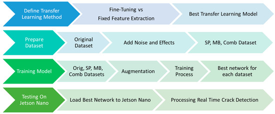 Figure 6 shows the methodology of the paper. In the first stage, two types of transfer learning are considered in this paper. The first method is the fixed feature extraction method. In the fixed feature approach, the original fully connected final layer of the pre-trained networks with an ImageNet dataset containing 1000 object classes is replaced by a new fully connected layer with only two categories, crack and non-crack/base. The rest of the layers remain the same. On the other hand, fine-tuning, the second transfer learning method, also utilises the pre-trained model, but the weights of all layers in the pre-trained model are optimised and updated during training. Additionally, a new fully connected final layer is added to the model to align with the target of the two categories (crack and non-crack/base). This approach enables the model to adapt its learned features to better suit the specific dataset.