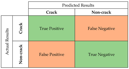 Figure 7 demonstrates the confusion matrix, which is used for determining the above performance parameters. True Positive (TP) indicates that both the predicted and actual results are crack images, while True Negative (TN) indicates that both the predicted and actual results are non-crack images. On the other hand, False Positive (FP) and False Negative (TN) represent a difference between the predicted and actual results. In particular, FP represents the prediction that the image is a crack when the image actually does not contain a crack, and False Negative (FN) represents the prediction that an image is not a crack when the image actually does contain a crack.