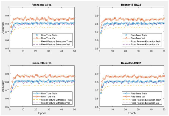 Figure 9 demonstrates the training process of two transfer learning methods, fine-tuning and fixed feature extraction. Both methods were tested with two neural network models (Resnet18 and Resnet50). The training process was conducted with the Original dataset (Orig) and two different batch sizes, 16 and 32 units. The hyperparameters for both methods were set with a learning rate of 0.001, momentum of 0.9, step size of 7 and gamma of learning rate scheduler of 0.1; these parameters are different to the real training models. It is shown in the plot that both models of CNNs are stable and start convergence after the first 10 epochs. The accuracy of the fine-tuning models is always higher than the fixed feature extraction models by approximately 7–8%. This is expected because the weights of all the layers can be optimised with fine-tuning, compared to just the weights of the final fully connected layer with fixed feature extraction.