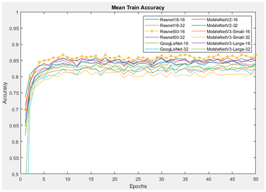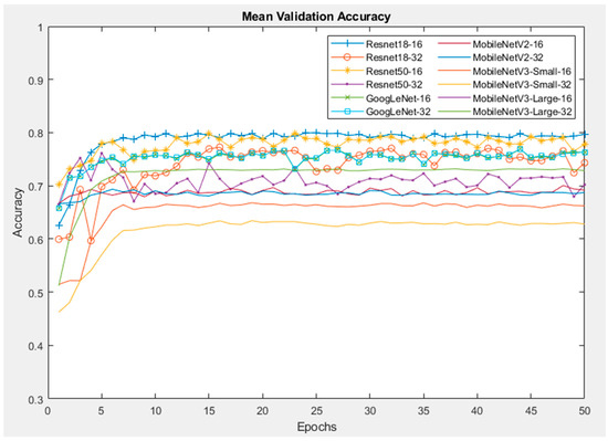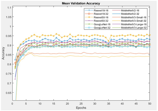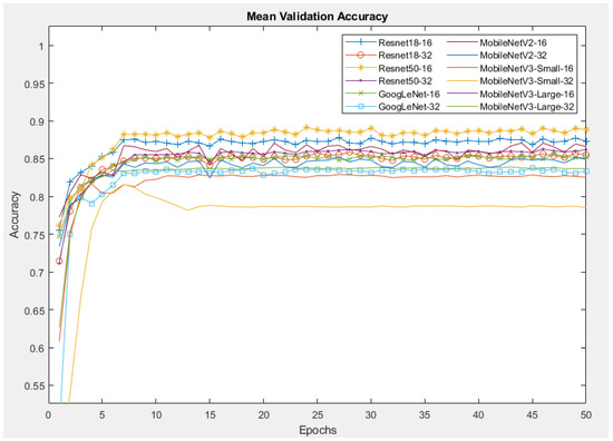 In this section, six CNNs were trained with the fine-tuning method of transfer learning. The training was repeated ten times with the Orig dataset. Figure 11 illustrates the mean training accuracy of all networks, which are similar between each run time. Furthermore, the training shows that the Resnet50 model with a batch size of 16 reaches a maximum training accuracy of approximately 85% before the first ten epochs and the accuracy then remains stable until the end. On the other hand, the MobileNetV3-Small network reaches its peak of training accuracy at 80%, which is lower than the other networks.