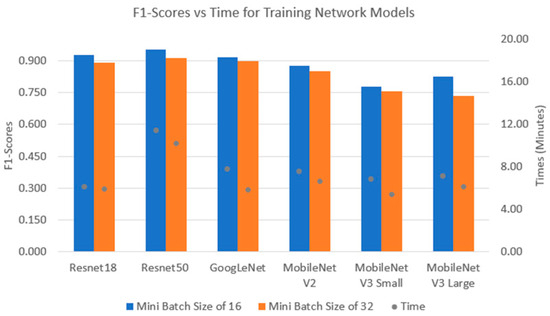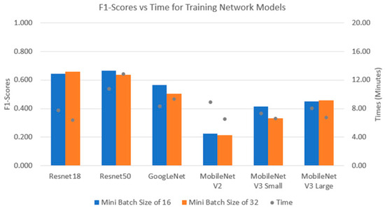 The performance indices and computational times of the CNNs can be found in Figure 13. For a batch size of 16, Resnet50 provided the highest F1-score of 95%, followed by Resnet18, GoogLeNet and MobileNetV2. MobileNetV3-Small and large networks yield the lowest F1-scores with a similar computational time compared to other networks. For a batch size of 32, Resnet50 achieves similar F1-scores to Resnet18 and GoogLeNet. On the other hand, Resnet50 took 5 more minutes for training time than the other CNNs.