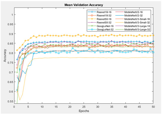 The mean validation accuracies of the CNNs with the SP dataset are shown in Figure 14. Similar to the Orig dataset, the Resnet50 and Resnet18 networks have the highest validation accuracies of 88% and 84%, respectively. The MobilenetV3-Small network has the lowest accuracy.