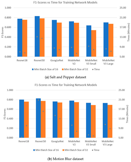 Figure 17 and Figure 18 illustrate the mean validation accuracy and F1-score/time performance of the CNNs, respectively, with Comb dataset. It can be seen that the computational time of each network in this dataset is no longer than that of the three other datasets, whereas the diversity of the dataset is increased by adding the SP noise and blur images into it, as well as the augmentations for the images. It is shown that the network with highest accuracy for this dataset is Resnet18 with batch sizes of both 16 and 32. Then, it is followed by the Resnet50 and GoogLeNet models. On the other hand, the MobileNet networks show a significantly poorer performance than the other networks, but their performances are stable and mostly flat without any significant fluctuations with an increasing number of epochs. However, when considering F1-scores, Resnet50 is the model with highest F1-score, followed by Resnet18 and GoogLeNet. Furthermore, the mean training time of Resnet50 was higher than all other networks.