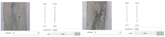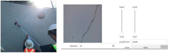 In the test, the Jetson Nano was linked to the inspectors’ laptop via Wi-Fi, which required both devices to be connected to the same network. As a result, the assessor was able to control and visualise the real-time predictions of the Jetson Nano. Figure 19 and Figure 20 show the Jetson Nano-based inference engine in action in the field and in the laboratory, respectively. The Jetson Nano-based inference engine predicted cracks in images with high accuracy. However, for some difficult concrete cracks or spalling, the device was unable to detect the aberration and gave the wrong decision. This problem might be solved by training against a much larger dataset and using more advanced models in future works.