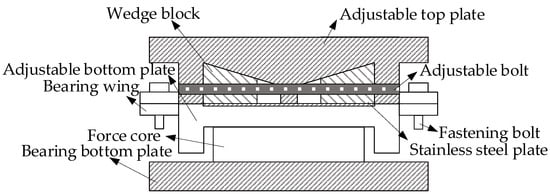 Bridge bearings are critical load-bearing components in the bridge support system. They balance and transfer the displacements and loads of the superstructure during the operation of the bridge [30]. The AIFMB adds a height adjustment sensor and a force measurement core, while replacing some of the original components. During its operation, the wedge blocks are securely self-locked between the upper and lower bearing plates to transfer the superstructure loads of the bridge. The height adjustment bolts connect the two wedge blocks to ensure the stability of the bearing (see Figure 2).