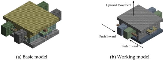 The adjustable top plate, adjustable bottom plate, and wedge are in contact through stainless steel and polytetrafluoroethylene materials. Therefore, the contact definition between components is set as Frictional contact, with a friction coefficient of 0.03. The contact between the adjustable bottom plate and the bearing core is defined as bonded contact. Considering that the contact surfaces among the bonded bottom plate, bearing core, force-bearing body, and cavity need to restrict friction, the component contact is defined as bonded contact. The contact between the threads and threaded holes is not considered; thus, the component contact is simplified and defined as bonded contact.